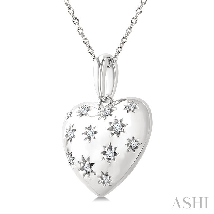 The heart, a timeless symbol of love and affection, represents deep emotional connections, making heart-shaped jewelry a meaningful gift for expressing love, passion, and devotion. This bold diamond heart pendant serves as a lovely reminder of heartfelt bonds and cherished relationships. It features a beautiful puffed heart adorned with 12 intricately carved star-shaped designs. Each star carving is set with a sparkling prong set round cut diamond, adding a touch of brilliance. A sleek sterling silver loop holder connects the pendant to a cable chain, offering a refined and elegant look. Both the pendant and chain are styled in rhodium finish sterling silver. Total diamond weight is 1/10 ctw.