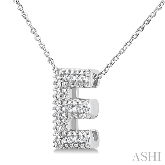 Perfect for gifting or treating yourself, this charming, personalized diamond initial fashion pendant captures the essence of individuality and sophistication. It features a bubble-textured face that adds a touch of whimsy and elegance to the design. The initial ‘E’ is embellished with 16 prong set round cut diamonds, which sparkle brilliantly against the sleek silver backdrop. Paired with a delicate 1.00MM SSL cable chain, both the pendant and chain are styled in a rhodium finish sterling silver. Whether worn alone or layered with other necklaces, this stunning initial fashion pendant is sure to become a cherished piece in your jewelry collection. Total diamond weight is 1/20 ctw.