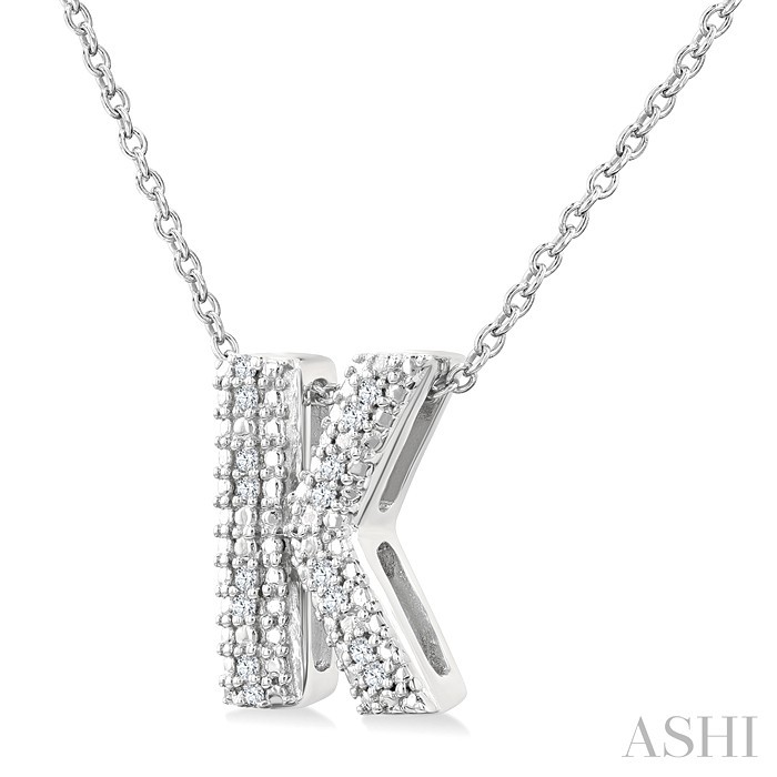 Perfect for gifting or treating yourself, this charming, personalized diamond initial fashion pendant captures the essence of individuality and sophistication. It features a bubble-textured face that adds a touch of whimsy and elegance to the design. The initial ‘K’ is embellished with 16 prong set round cut diamonds, which sparkle brilliantly against the sleek silver backdrop. Paired with a delicate 1.00MM SSL cable chain, both the pendant and chain are styled in a rhodium finish sterling silver. Whether worn alone or layered with other necklaces, this stunning initial fashion pendant is sure to become a cherished piece in your jewelry collection. Total diamond weight is 1/20 ctw.