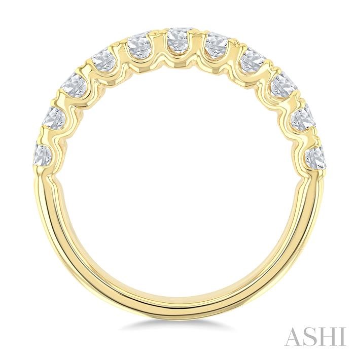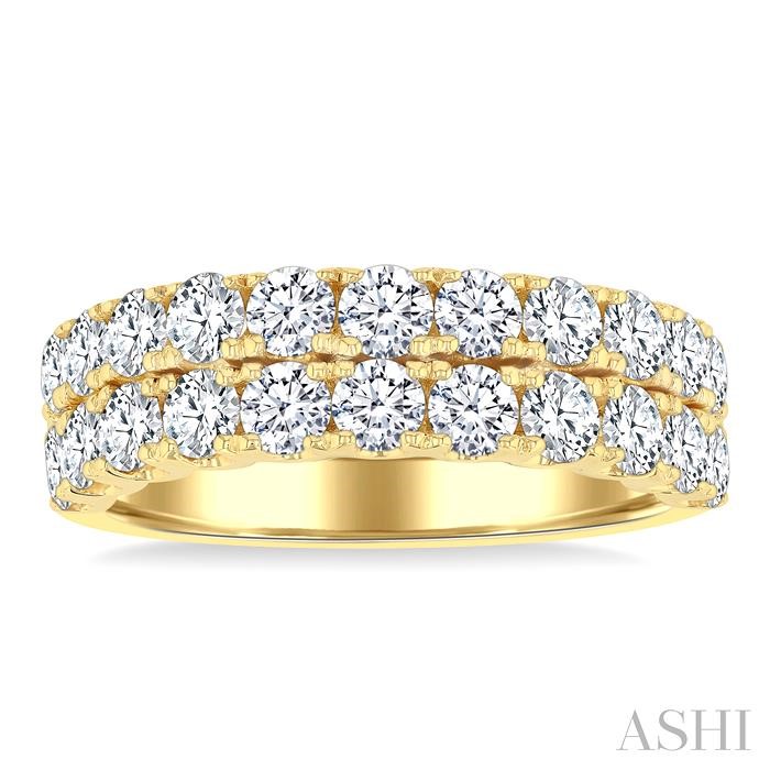 A gorgeous diamond wedding band, this offers beauty and aesthetic appeal, making it an instant attraction. The wide band features a twin-row design, each row shimmering with 11 prong set round cut diamonds, totaling 22 diamonds. Each diamond is carefully arranged to create a stunning display of brilliance, making this band a true statement piece. Fashioned in a polished finish 14 karat yellow gold, the wedding band offers a timeless elegance that is both luxurious and sophisticated, perfect for celebrating your enduring commitment. Total diamond weight is 2 ctw.