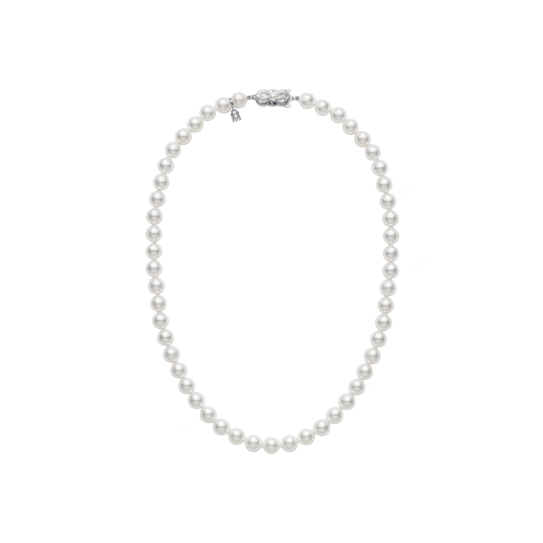Feel like a princess in the Mikimoto Princess Akoya Strand, touting 7×6.5mm white pearls along an 18″ chain of 18kt white gold.