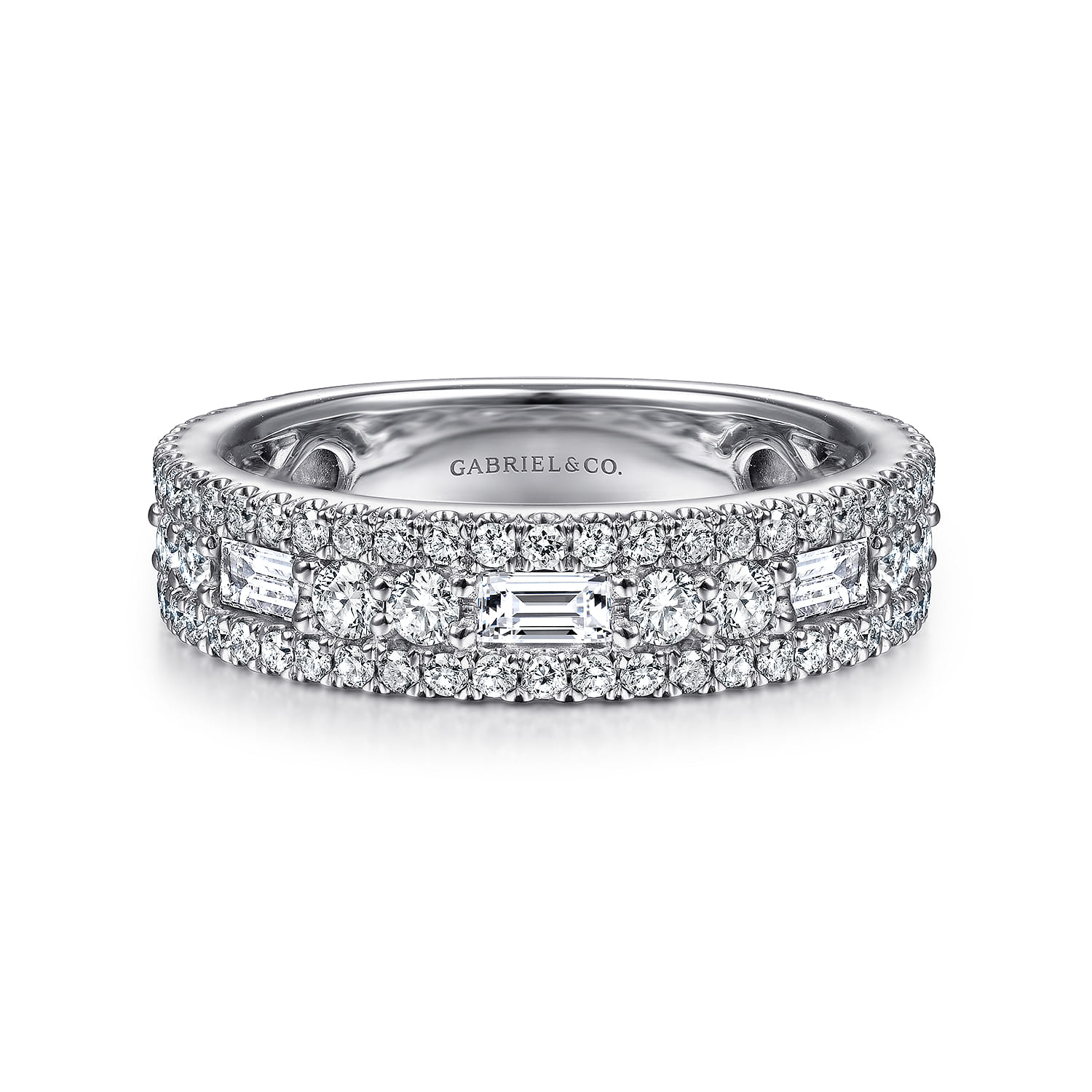 Forged in polished 14k White Gold, this substantial anniversary band features a unique triple-row design. The center row is anchored by architectural Baguette Diamond stations, separated by brilliant round diamonds, while two outer rows of pavé diamonds create a continuous “wall of sparkle” that catches the light from every direction.